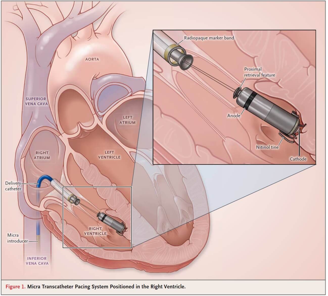 2014年に世界で初めてリードのない画期的なペースメーカシステムが発表され、リードレスペースメーカと呼ばれております。大腿静脈からアプローチし、わずか1cc/1.75gのデバイスのみを右室内に挿入するペースメーカです(図1:N Eng J Med 2016; 374: 533-41)。