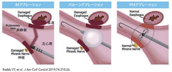 PFAの大きな利点は、組織により感受性が異なるため、エネルギー等をコントロールすることで、心筋組織を選択的に傷害できます。そのため、周囲組織への直接的な影響が少なく、合併症が減ることが考えられ、急速にその使用が広まってきています。他のカテーテル治療に比べ、溶血による急性腎機能障害が報告されていますが、パルス出力回数を増加させないことで、予防できます。貧血や腎機能障害のある患者さんには注意が必要です。
