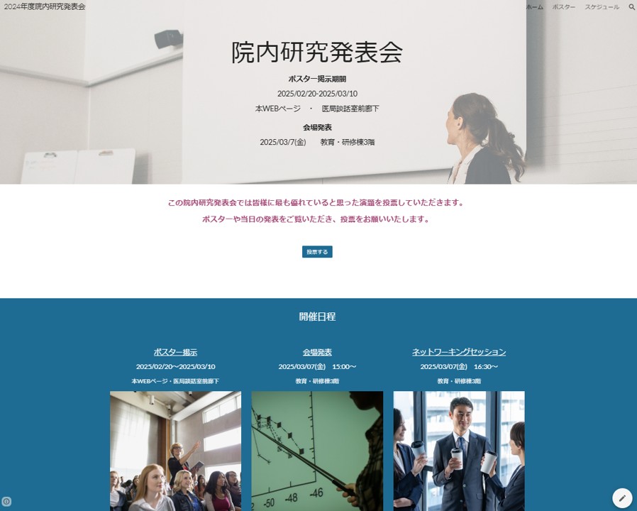 2024年度より、「院内学会」は「院内研究発表会」へと名称を改め、研究成果を院内全体で共有し、多職種が関わる交流の場として開催されました。ポスター掲示とライトニングトークを組み合わせた発表形式を導入し、全職員が投票できる制度を取り入れることで、より多くの職員が研究に関心を持ち、評価に参加できる仕組みを構築しました。