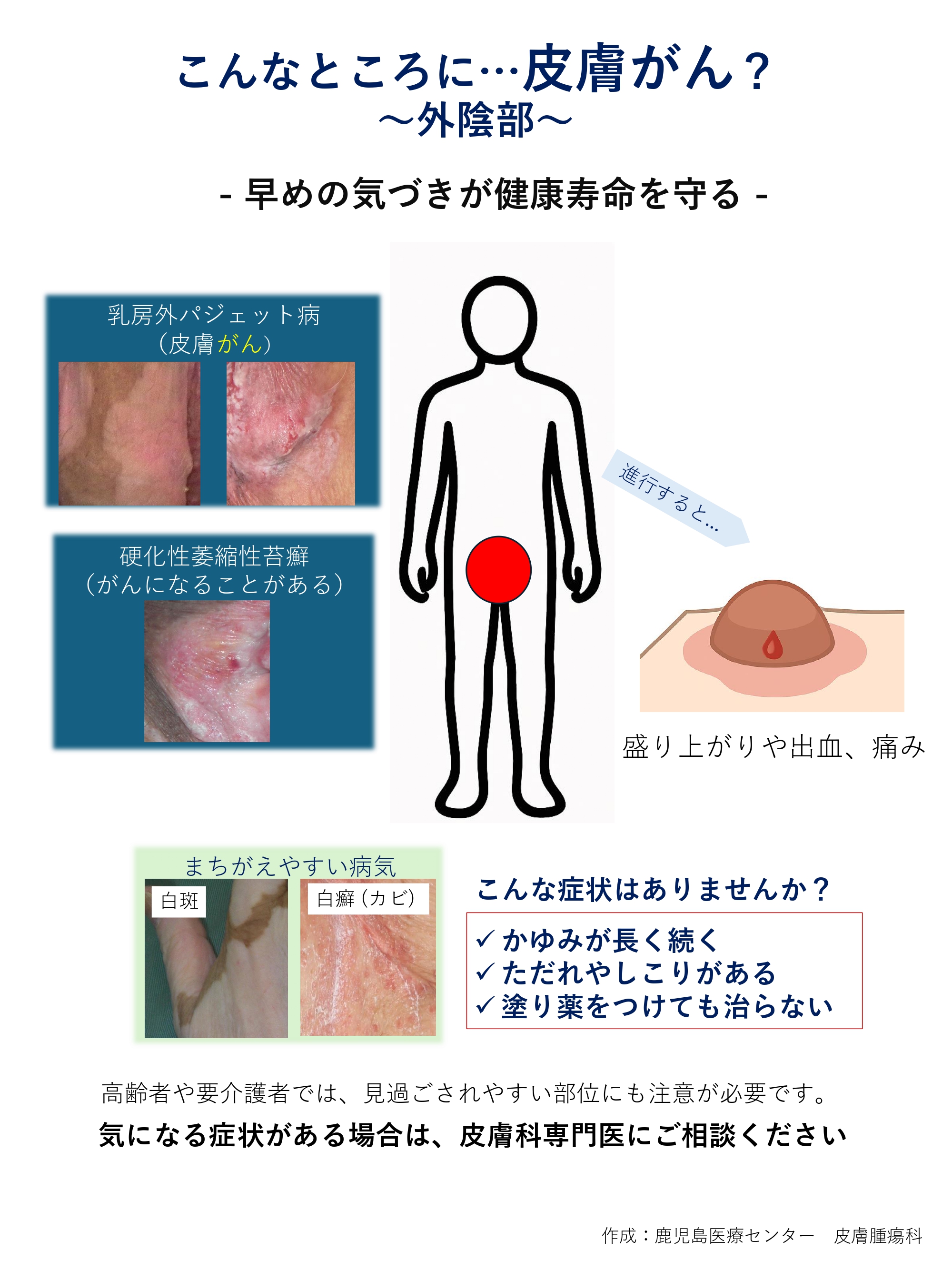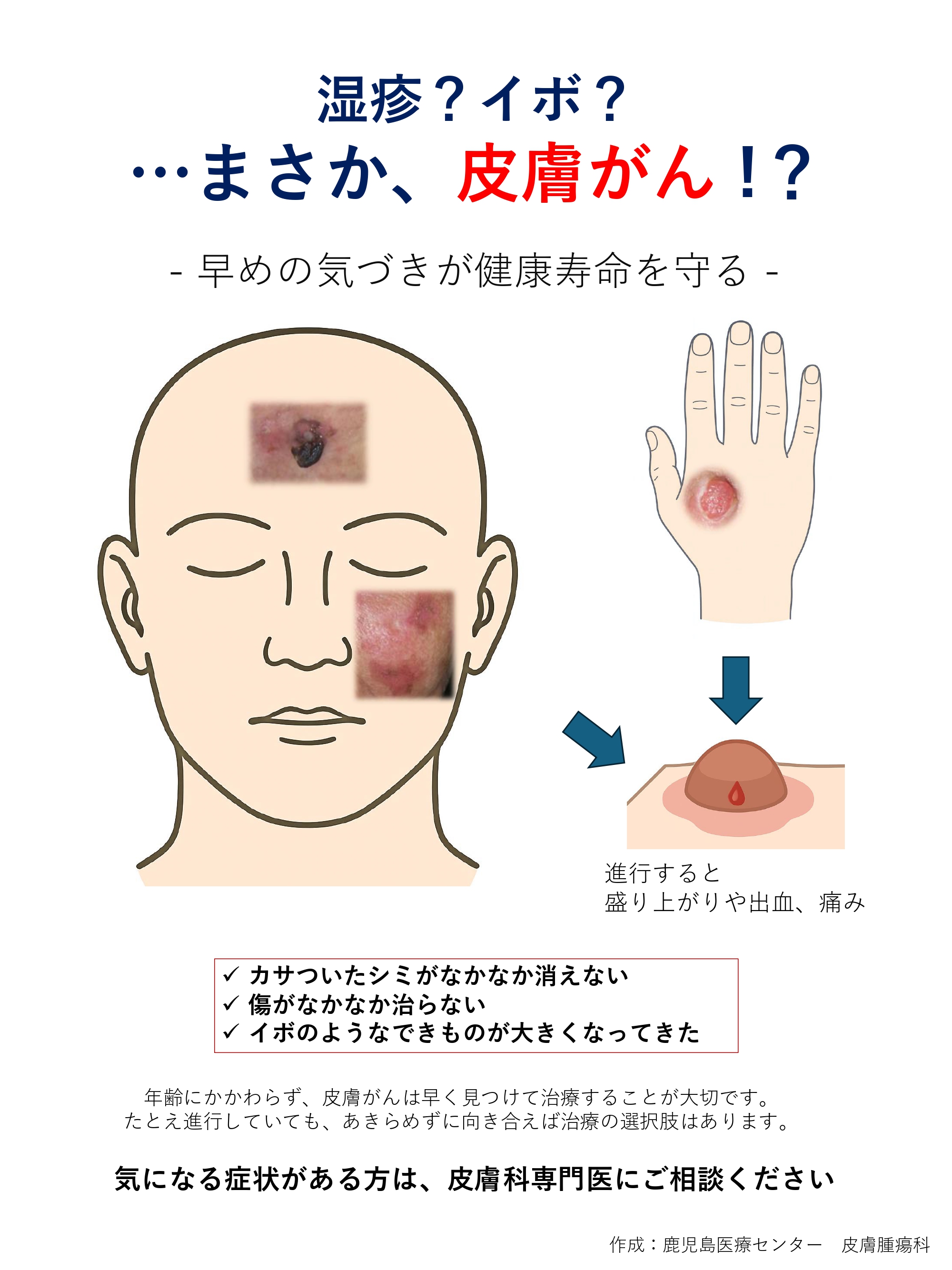 鹿児島医療センター皮膚腫瘍科では、こうした課題に対応するため、疾患啓発活動に力を入れています。一般向けの教育資料を作成し、患者さんの同意を得た初期病変の臨床写真を、個人や部位が特定できないよう加工し、受診を促す内容としています。医療・介護従事者向けには、進行例の写真も加え、より正確に病態を把握できる資料を作成しています。 皮膚がんの症状や進行について広く知っていただき、患者さんが不快な症状を長く抱え込むことのないよう、私たちは今後も適切な治療法を提案し続けます。 (文責:皮膚腫瘍科部長 青木恵美)