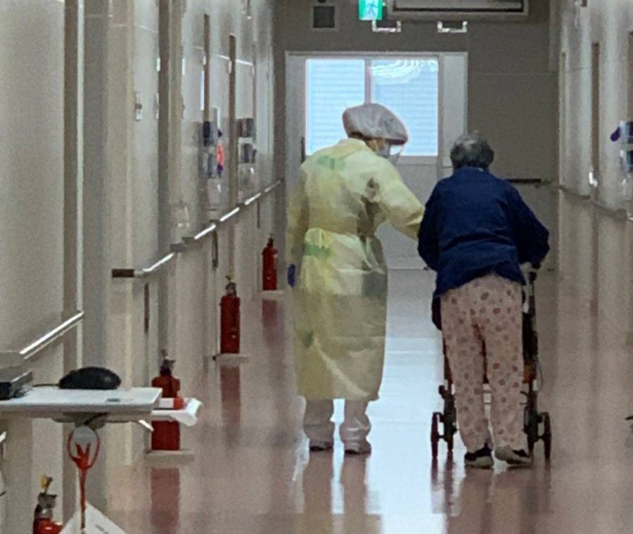 いざ開院すると多くの問題に直面し、私たちが作成した業務手順は部分的に「机上の空論」であったと気付かされ、毎日修正を余儀なくされました。また、入院患者さまの多くは施設のクラスターで感染した認知症や知的障害の方だったため、徘徊したり、環境の変化に馴染めず興奮されたりと、コロナ感染の治療だけにとどまらない対応が必要とされました。さらに、プレハブならではの問題もあり、外気温はそれほど高くなくとも日差しにより病室内の温度が上昇したため、飲水を促すなどの脱水症対策が必要でした。また、高齢の患者さんが10日間病室にいることで日常生活機能が低下することも考えられたので、看護師と行うリハビリも取り入れました。