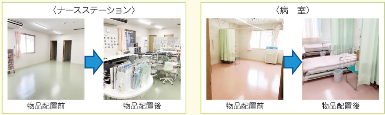 3月1日、コアメンバーである師長、副師長、看護スタッフの計8名が集結し、本部からの指令を受けました。指令内容は、「3月10日に開院できるように必要な準備を行い、必要とされる物品を洗い出す」というものでした。この日プレハブはまだ建設中であり、施設に立ち入ることができず、隣の東京病院に場所をお借りして準備開始となりました。「必要な準備」とは、業務手順の作成、施設のレイアウト作成、電子カルテ操作マニュアル作成、多職種との連携方法、薬品や物品の定数決定、入院患者さま向けの資料作成など多岐に渡りました。私たちコアメンバーは途方に暮れる間もなく、自然に役割分担を行い淡々と業務を進めました。3月7日、やっとプレハブでの作業が開始となり、病室・ナースステーションの物品配置やゾーニングを行った後、その日の午後に多職種で入院患者の受け入れについてシミュレーションを行いました。もちろん1日ではうまく進まなかったため、翌日も設営や多職種での話し合いを繰り返しました。3月9日午後に全国から43名の看護スタッフが集結したので、オリエンテーションを実施し、3月10日の開院に無事こぎつけることが出来ました。土日も挟んだため、実質7日間で、ゼロから開院準備を行ったことになります。