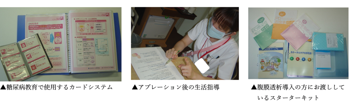 腎不全治療では、腹膜透析導入から自宅での自己管理を目標に、受け持ち看護師を中心に、薬剤師、管理栄養士、臨床心理士、外来看護師、退院調整看護師と患者さまサポートを図っています。退院前は、退院前カンファレンスの開催、自宅訪問を実施し、患者さまが手技を獲得後も安心して自宅で過ごせるような支援を行っています。