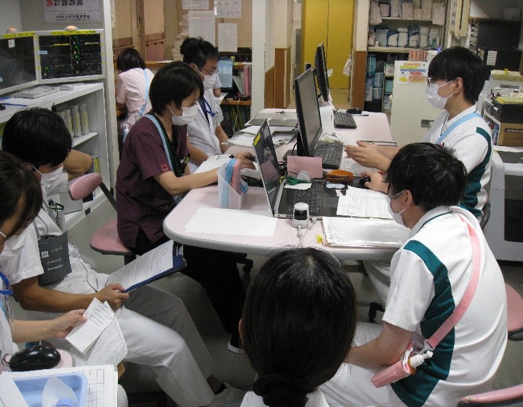 高齢化に伴い、入院患者さまの半数が80~90代の方であり、高齢者看護、認知症看護にも取り組んでいます。入院中だけでなく退院後の生活も見据え、リハビリカンファレンスを通して理学療法士と転倒予防について検討し、患者さまが安心・安全に過ごせるよう努めています。急性期から終末期までそれぞれの患者さまに寄り添った看護、そしてチーム医療ができるように、これからも多職種で協力、連携していきたいと思います。地域連携については、昨年、心不全の地域連携パスが完成しました。今後は関連病院と連携し、心不全患者さまの治療・看護がシームレスに行えるよう取り組んでいきたいと思います。