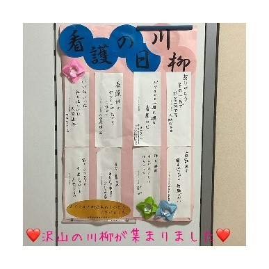 また、4月末より川柳を募集し、患者さんや職員より多くの投稿をいただきました。病気に向き合い、治療に臨む患者さんの思いや看護師への感謝の言葉など心温まるものばかりで、明日からの看護への活力になりました。職員からの川柳では「あるある」と思わず言ってしまうような、クスッと笑顔になる内容がありました。福祉用具の展示では、2種類の最新歩行器が展示され、興味を持たれた患者さんやご家族が足を運んでくださいました。