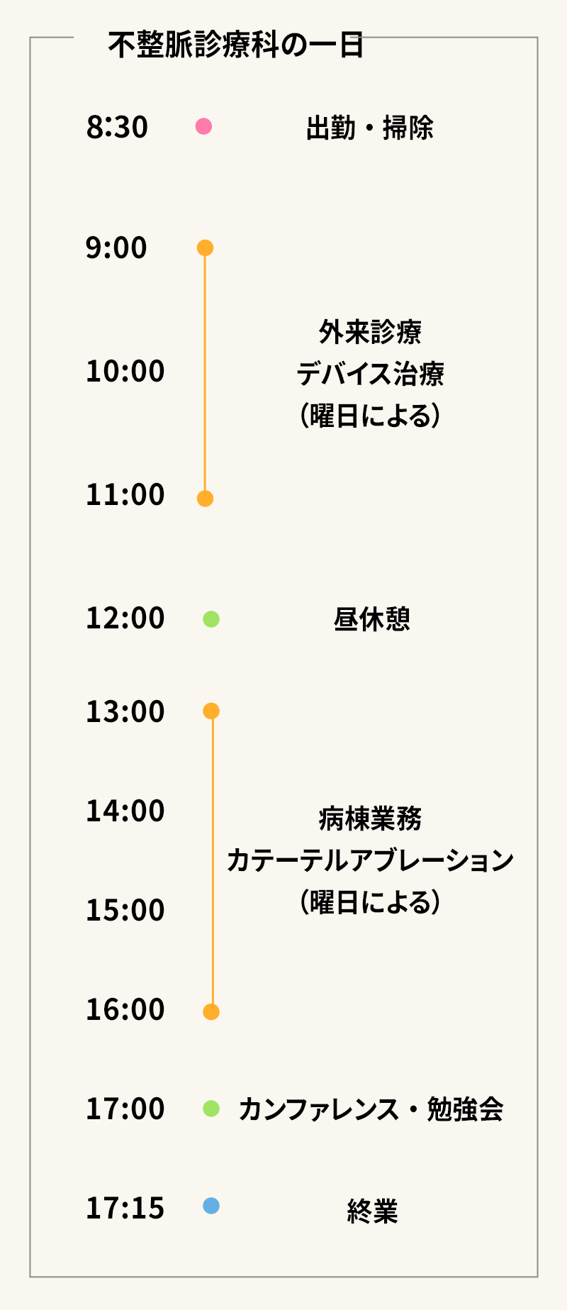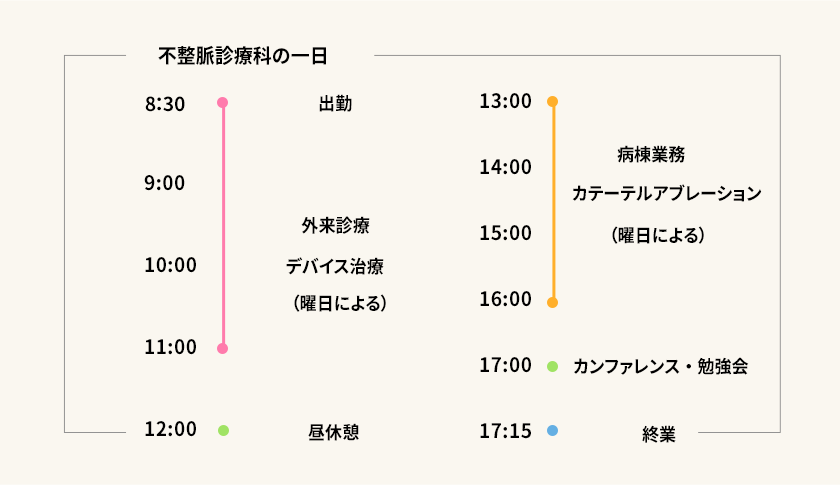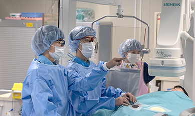 当科では不整脈に関する診断・治療について幅広く学べます。カテーテル、アブレーション、ペースメーカー植え込み(リードレスペースメーカーを含む)、植込型除細動器(両心室ペーシング機能付、皮下植込み型除細動器を含む)リード抜去を行っています。第2循環器とも密に協力しながら、チーム医療を重視しながら行っています。