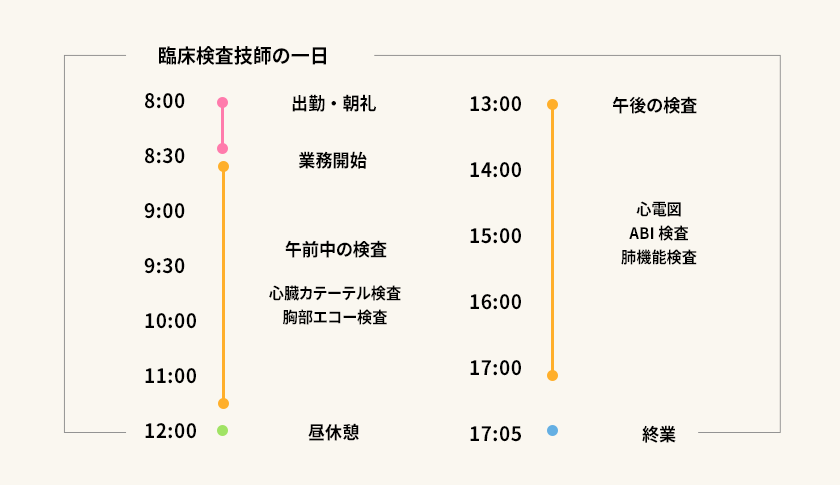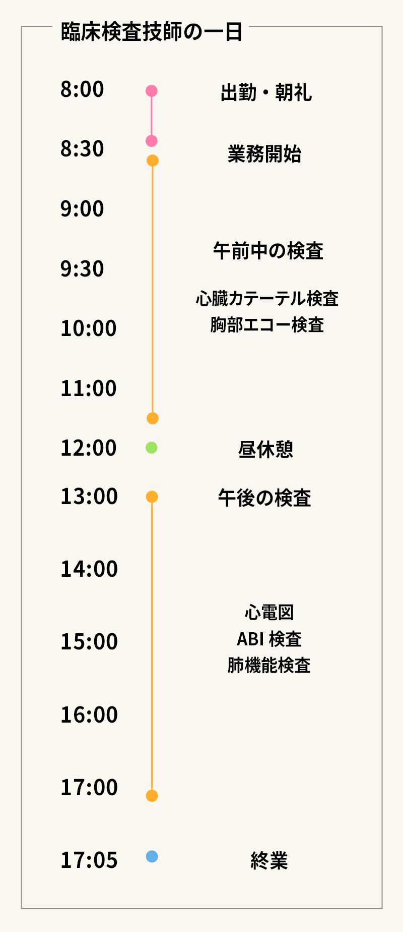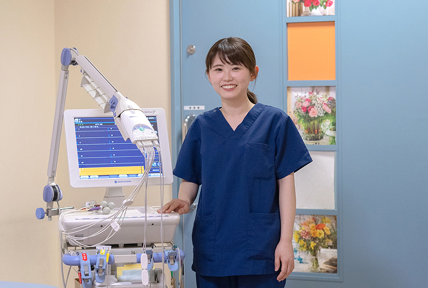 現在、生理機能検査室に勤務しております。主に心電図・ABI検査・肺機能検査・エコー検査を中心に日々の業務に携わっています。
