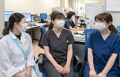 業務で分からないことも聞きやすく、プライベートなことも話しやすい環境です。また検査科全員で切磋琢磨しスキルアップを図っています。他の医療スタッフとのコミュニケーションも大事にして業務に励んでいます。
