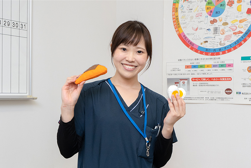 入院患者様にとって「食事」は大きな楽しみの一つ!病態や栄養状態だけでなく、患者様の思いや悩みに寄り添いながら、「食」を通して携わりたいと思ったのがきっかけです。急性期から慢性期に至る栄養管理において、スペシャリスト→ゼネラリストへ成長できるように日々精進中です!